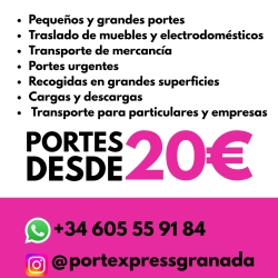 Hola!! Somos PORTEXPRESS una empresa dedicada al servicio de portes desde 20€!! Contáctanos a través de nuestras redes sociales o través de nuestro teléfono 605559184. PORTEXPRESS, movemos lo que importa.